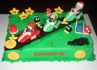 Back to the cake, this client of mine L, has been ordering all of kids cakes from me since last year. I think this is the 3rd or 4th cake I have done so far. I have noticed that each time the design of the cake gets more complicated which for me is a good thing because she is recognizing that I can do much more than she thought I could initially :) She always orders the same flavor combination 1/2 vanilla with oreo buttercream and 1/2 strawberry with vanilla buttercream. So this time was no different except the theme. This cake was for her son who turned 7 and he wanted a Super Mario Brothers theme cake. The twist was that he wanted Super Mario Go Kart theme. I am somewhat familiar with the game since the hubby plays video games so I had an idea, but I had to google the actual characters so I can see what the go karts looked like and how the characters sat in the go karts.